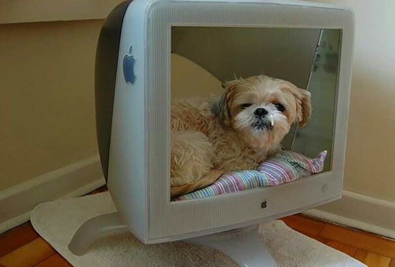 Um proprietário reaproveitou um antigo monitor de computador da Apple para criar uma pequena cama de cachorro. A área é perfeita para este pequeno cão se enrolar. O design é bastante básico com um pequeno travesseiro dentro para adicionar conforto.