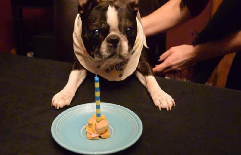 Esta fotografia capturou o momento depois que o cachorro apagou sua vela de aniversário. O dono colocou o cachorro na frente de sua pequena sobremesa – uma pilha de guloseimas para cachorro – e acendeu a vela em cima. Em vez de se inclinar para apagar a vela para ele, ela recuou e o deixou tentar.