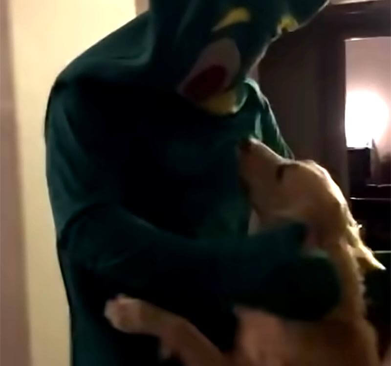 A melhor parte é ver o cachorro descobrir tudo. No início, ele se levanta com um olhar de surpresa aparente em seu rosto. Então, ele lentamente dá alguns passos em direção ao dono fantasiado. Por fim, o cachorro pula nos braços do dono, o joga no chão e começa a vomitar.