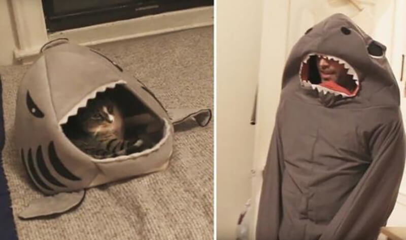 Este dono decidiu vestir-se de tubarão, que aparentemente é o animal favorito deste gato. A gata estava descansando em sua cama de tubarão, como sempre, quando de repente seu dono vira a esquina com essa fantasia de tubarão.