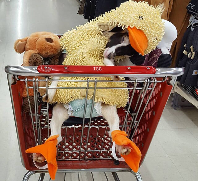 Seu dono descobriu que Polly adorava ser enrolada em cobertores. Quando Polly tentava se movimentar, os cobertores caíam. Então, quando sua dona viu essa fantasia de pato, ela imaginou que teria o efeito calmante de ser enrolada enquanto permitia que a cabra se movesse. Outras fantasias não tiveram os mesmos resultados; Polly se sentiu melhor quando vestida de pato.