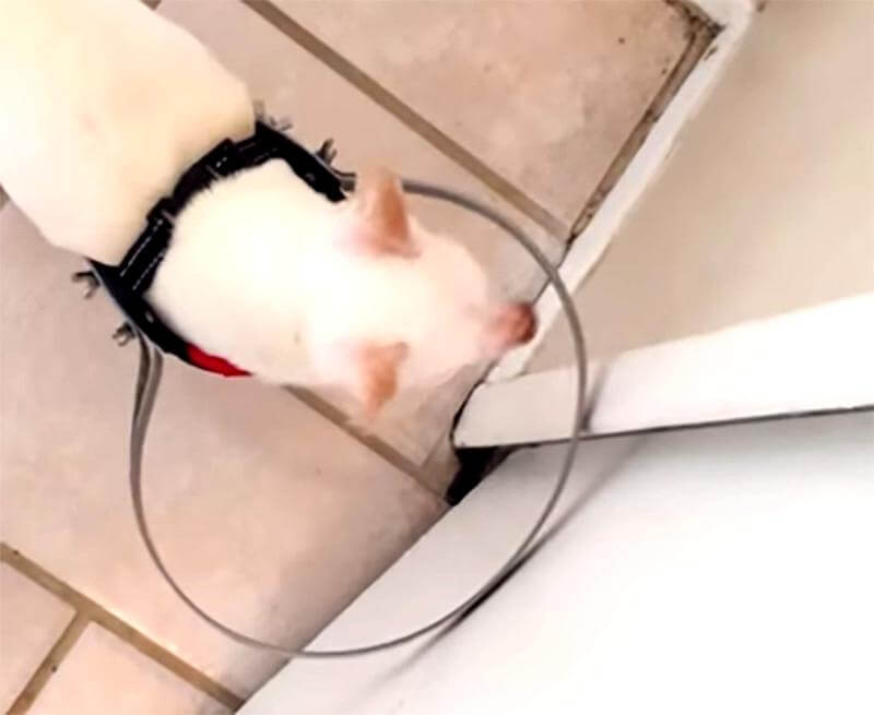 Para ajudá-la a recuperar suas habilidades de orientação, os proprietários criaram esta engenhoca única. O laço de plástico é preso à coleira do cão de forma que fique seguro sem ser desconfortável. Como esta foto mostra, o canino agora pode se mover livremente pela casa sem bater no rostinho.