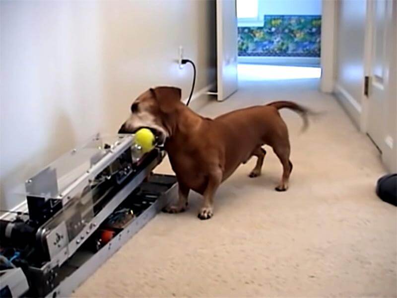 É por isso que um dono construiu uma máquina que joga a bola para o cachorro. O canino carrega a bola, depois dá um passo para trás enquanto a máquina lança a bola pelo corredor. O aparelho também possui um contador que mostra quantas vezes a bola foi arremessada. Quando este vídeo foi filmado, o filme mostrava o contador com impressionantes 10.000 arremessos.