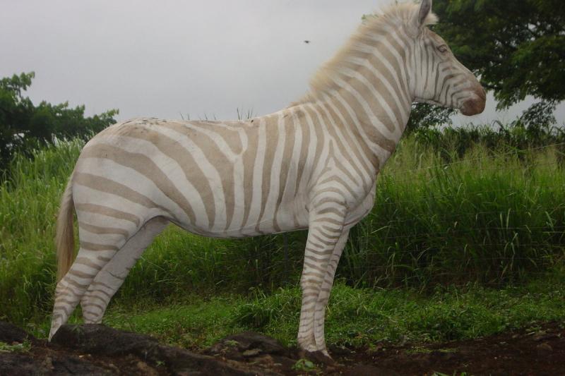 Esta é Zoe, uma zebra extraordinariamente brilhante que vivia em um santuário particular em Kona, Havaí. A maioria das pessoas apenas a chamaria de zebra loira, devido às suas listras bronzeadas e olhos azuis. Embora a maioria das pessoas a rotule como albina, os pesquisadores parecem divididos no diagnóstico devido à definição incerta. Hipopigmentação mais preferida, que é uma rara redução de melanina.