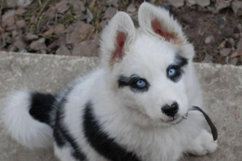 É raro encontrar um husky com manchas. Normalmente, os huskies ostentam casacos completos de pele branca, cinza, preta ou marrom. Este adorável filhote provavelmente é uma mistura e obteve suas grandes manchas pretas de outra raça. O que realmente chama a atenção, duro, são os olhos dos cães. Eles podem tirar algum delineador sério.