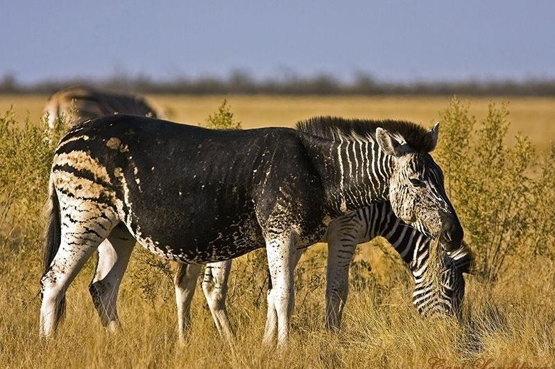 Esta zebra é outro exemplo de melanismo. As zebras pseudo-melanísticas têm uma pelagem tão escura que manchas de sua pelagem podem parecer manchadas em vez de despojadas. Pode parecer estranho para nós, mas essa coloração do pelo, felizmente, ajuda a se misturar. Além disso, essas manchas marrons no espaço branco da zebra vêm com o melanismo.