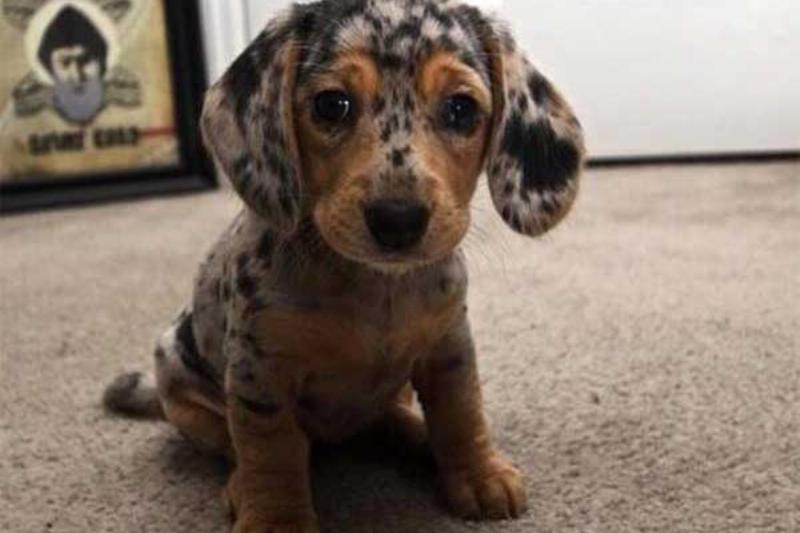Este adorável cachorrinho é um Dappled Dachshund, muitas vezes referido pelos fãs de Dachshund como um “Dapple Doxie”. A pelagem fabulosa é causada por um gene dominante e pode ou não ser semelhante à pelagem da mamãe ou do papai. Um dos pais tem que ser um malhado para produzir um filhote malhado.