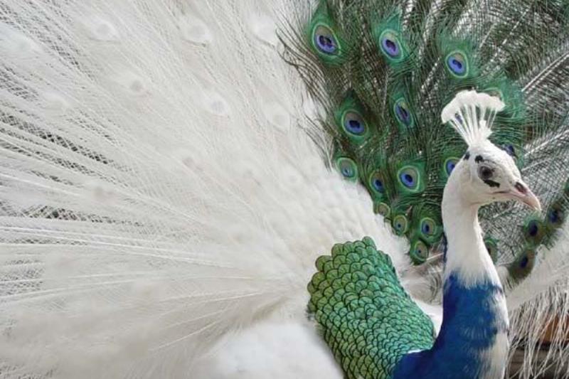 Os pavões são quase sempre magníficos de se olhar, exceto quando estão correndo atrás de você. Então, nem tanto. Esta ave rara é outro exemplo de animal leucístico. No caso de nosso amigo emplumado, deixou-o predominantemente branco com alguns respingos de suas cores de marca registrada no corpo e na cauda.