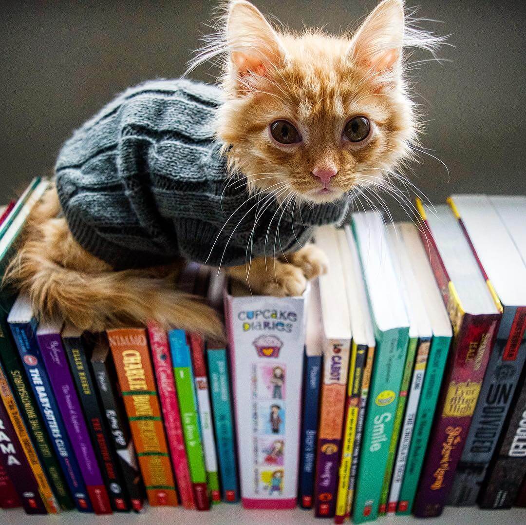 Ele pode sentar em uma prateleira alta e olhar os livros. Ou ele pode simplesmente sentar nos livros para aquecê-los para os futuros leitores. O trabalho dele é muito importante.