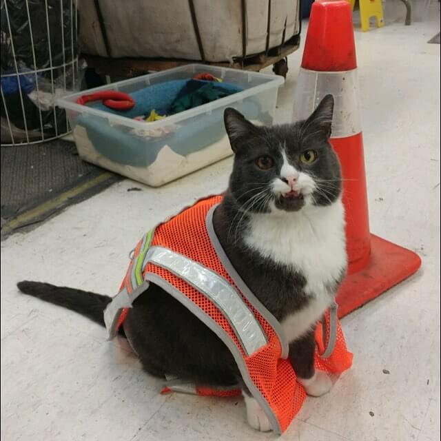 Esse é o Ozzy. Ele é um gato de oficina. Ele trabalha em uma oficina e usa um colete laranja refletivo. É importante usar um colete para que as pessoas possam vê-lo de longe. Ozzy sabe da importância da segurança na oficina.