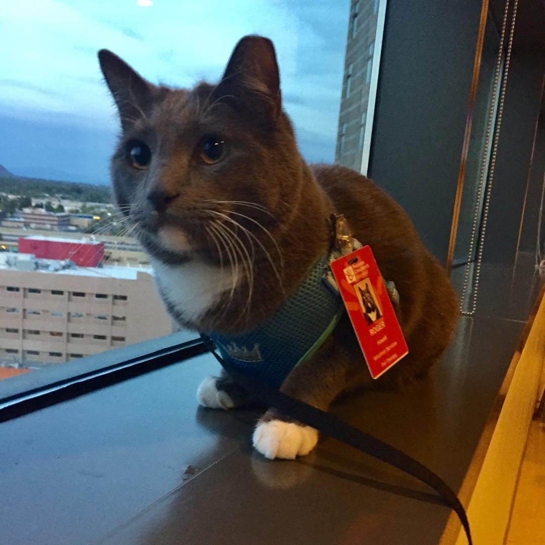 Eu sei, trabalho difícil. Ele tem um crachá chique para que todos saibam que ele é um gato em missão. Ele está aqui para trabalhar de verdade.