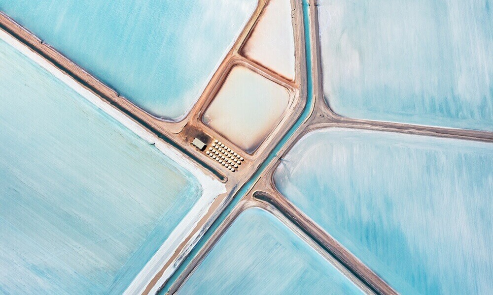 Esta imagem foi capturada por Simon Butterworth, voando a uma altitude de 4.000 a 5.000 pés para tornar as imagens o mais detalhista possível. Ele observou que “as trilhas onde as máquinas de colheita de sal trabalharam nas salinas parecem para todo o mundo como pinceladas de pintura em aquarela”.