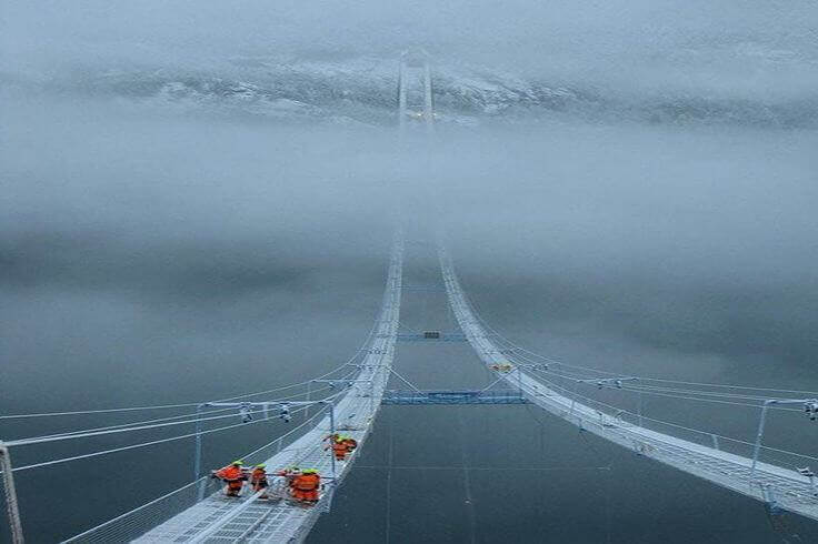 Esta é a ponte Hardanger na Noruega. Para escala, você pode ver os trabalhadores da construção trabalhando na ponte de cabos superior, fazendo parecer que é a ponte real. Toda a Hardanger Bridge tem aproximadamente 1310 metros, que é 20 metros mais longa que a Golden Gate Bridge em São Francisco, tornando-se a 9ª ponte mais longa do mundo inteiro.
