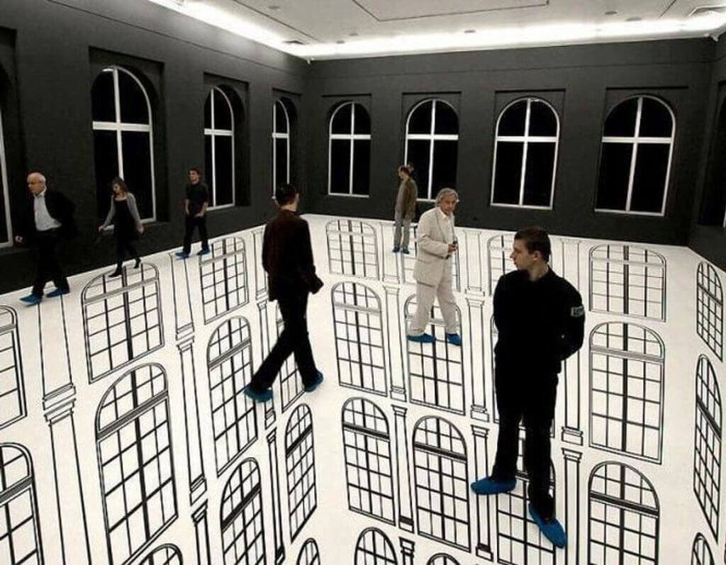 O chão em que as pessoas estão é simplesmente pintado para dar uma aparência 3-D. Pessoas com medo de altura provavelmente teriam alguns problemas com esta sala, pelo menos até terem certeza de que o piso é, de fato, real e nivelado.