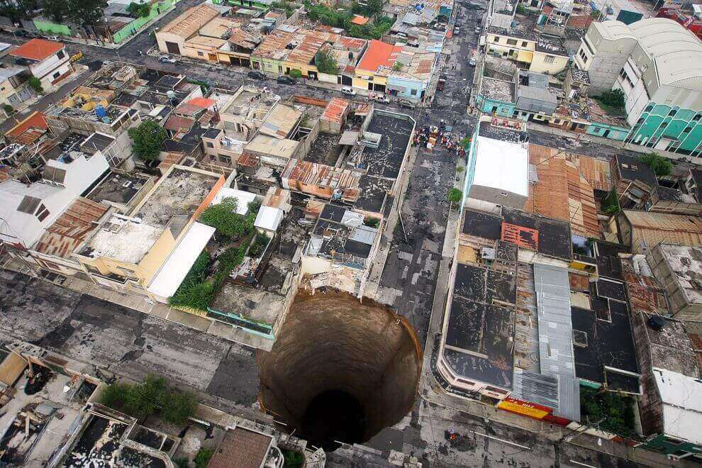 Após as chuvas da tempestade tropical Agatha na Guatemala, um sumidouro gigante se abriu na parte norte da capital, engolindo uma área maior que um cruzamento inteiro de ruas. Junto com toda a rua, um prédio de três andares e uma casa também caíram no abismo, deixando pelo menos 53 desaparecidos.